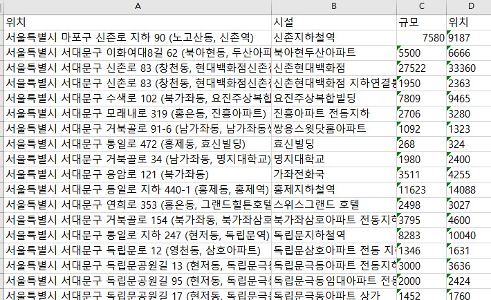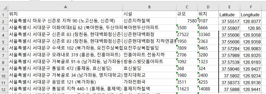위와 같은 지오코딩 사이트를 이용해 수작업을 하거나 셀리니움을 이용하는 방법도 있지만