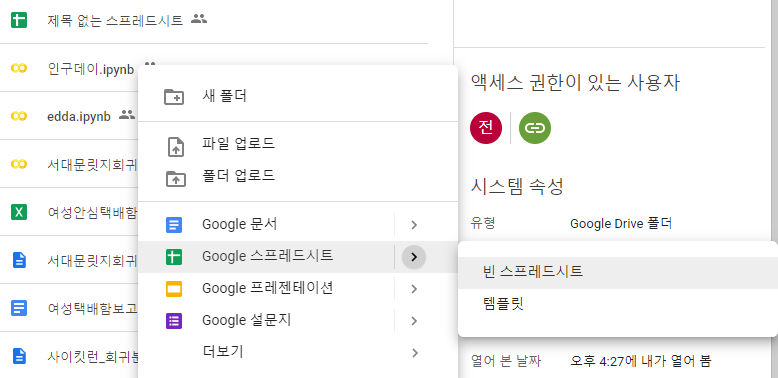 1. 먼저 구글 드라이브를 들어가서 오른쪽 클릭을 하여 빈 스프레드 시트를 만들어준다.