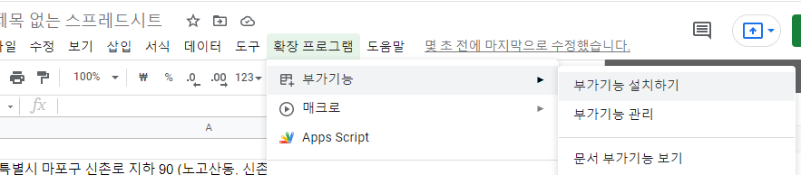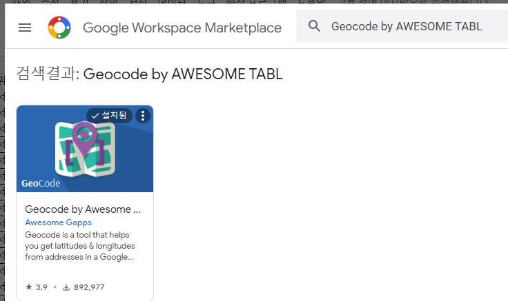 2. 부가기능 설치 탭에 들어가 Geocode by AWESOME TABL 을 검색하고 설치해준다