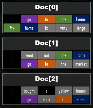 각 문장 ( Doc[n] ) 마다 생성한 단어 사전을 컬럼 ( key 값) 으로하는 벡터를 생성한다.
