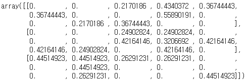 극단치를 가지는 값들을 완만하게 만들기 위해 L2 정규화를 적용하여 최종 TF-IDF를 구한다.